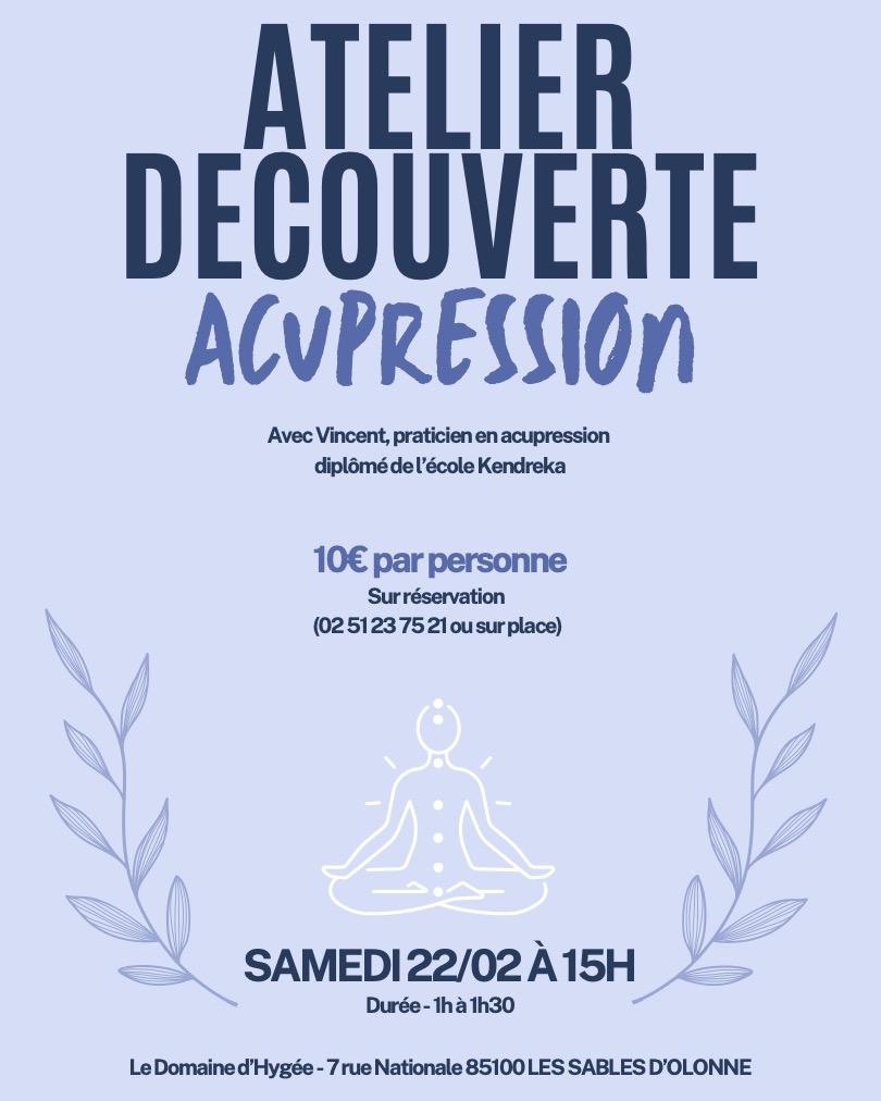 Venez vous initier aux bienfaits de l’Acupression (Digitopuncture) lors de notre Atelier Découverte ! La place est à 10€ sur réservation (en boutique ou bien par téléphone au 02 51 23 75 21).